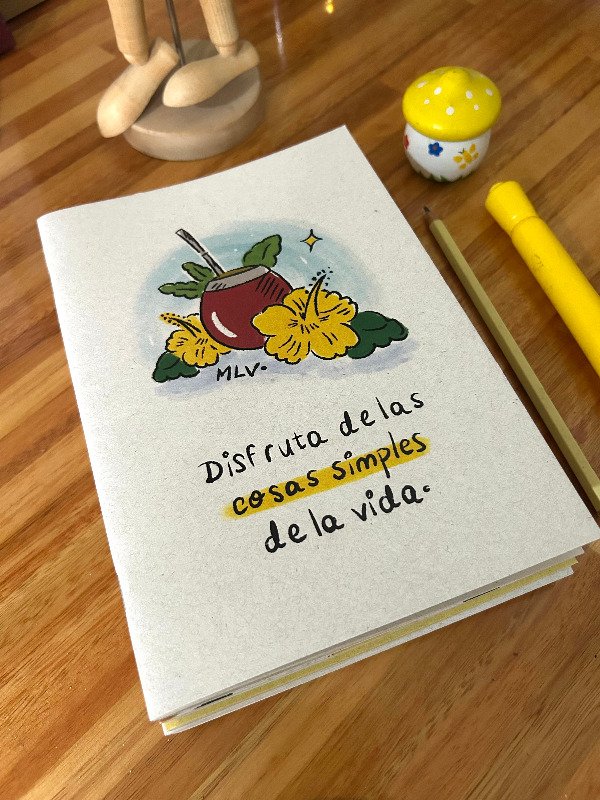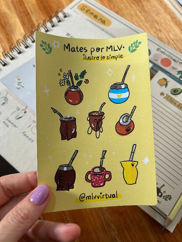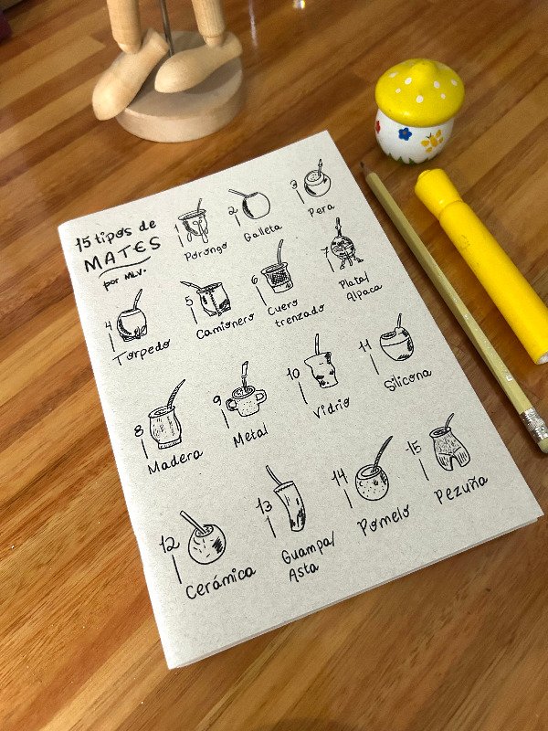 Incluye: un block lista de compras, dos libretas con tapa y contratapa ilustradas (diseños: 15 tipos de mates y disfruta de las cosas simples de la vida), un planner semanal ilustrado, una plancha de stickers de matecitos, un lápiz grafito (pastel) & una postal de 15 tipos de mates.