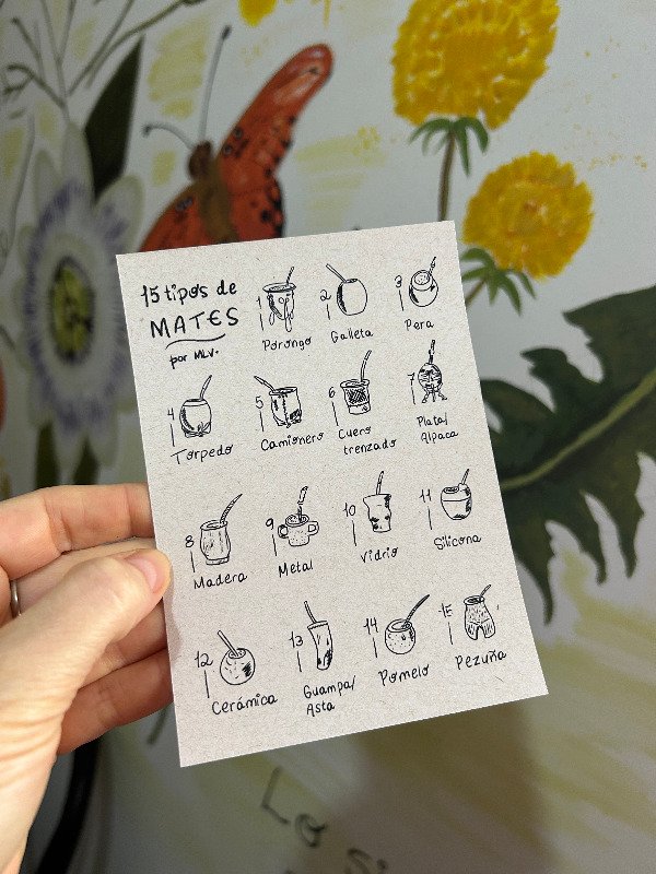 Postal son ilustración "15 tipos de mates" realizada a mano por mlvvirtual, impresa sobre cartulina reciclada de 300 grs, color natural.