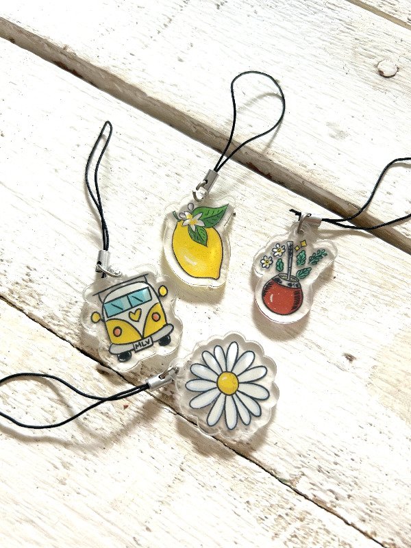 • Dije colgante de acrílico ilustrado a mano por @mlvvirtual a elección: matecito, margarita, kombi o limón (elegís vos el que más te guste!)